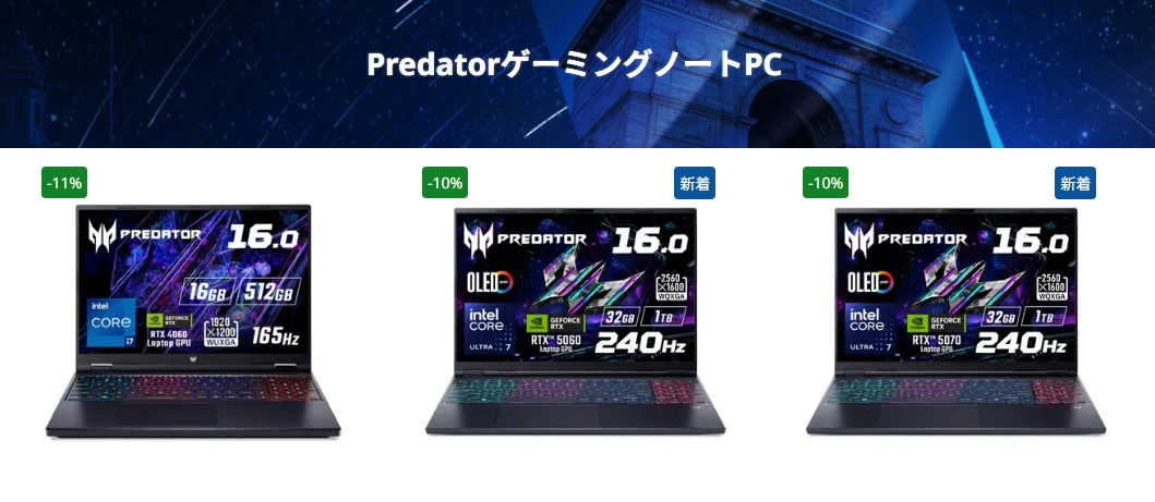 おすすめシリーズ:「Predator Helios 300」「Nitro 5」など。