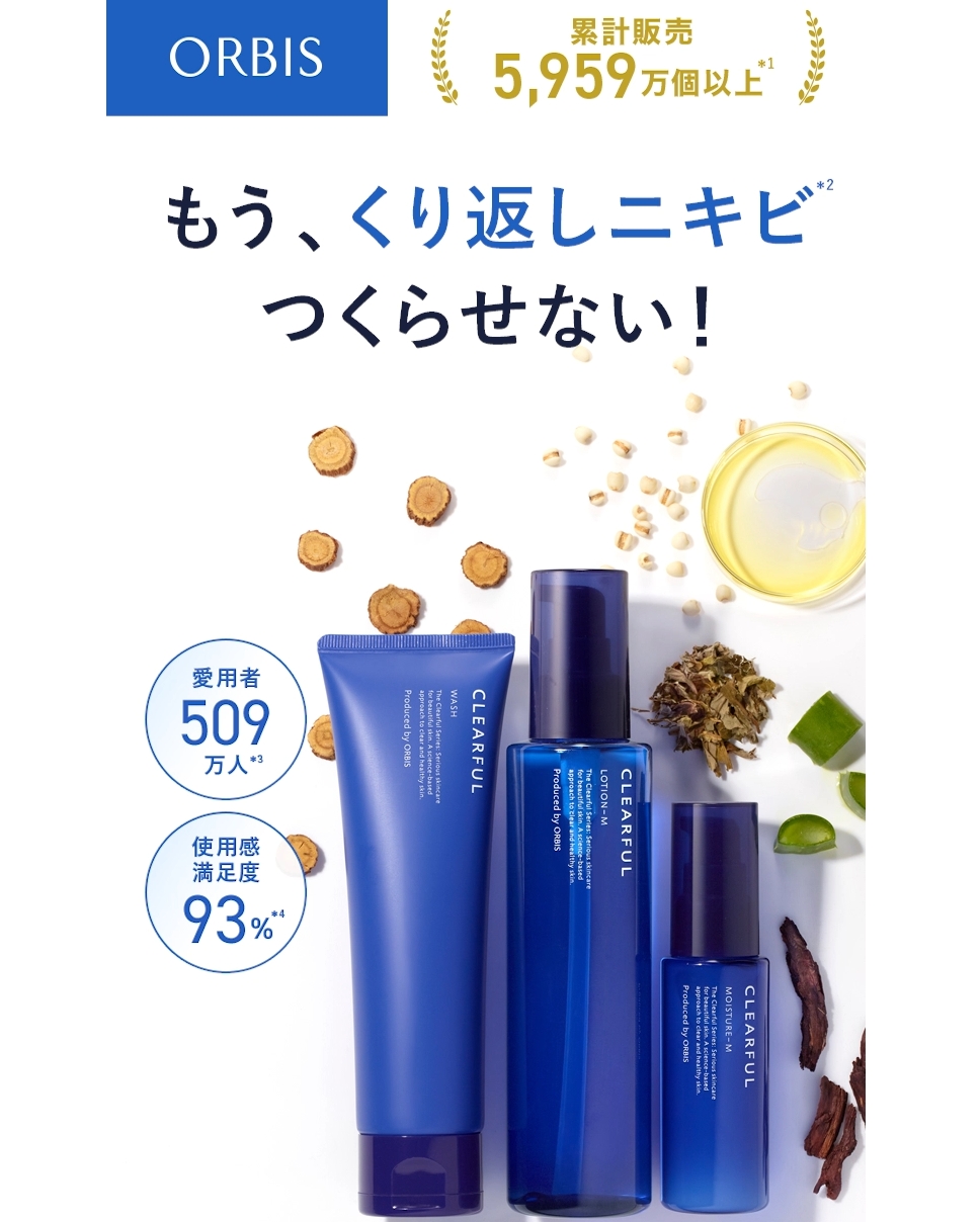 オルビスの「クリアフルシリーズ」は、和漢植物エキスや整肌成分、やさしい処方設計で、デリケートになりがちなニキビ肌を支えてくれるシリーズです。