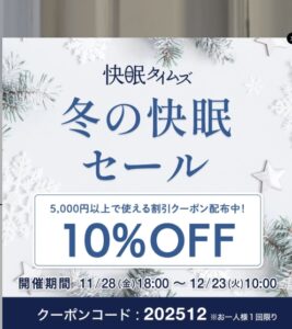 現在、快眠タイムズでは5000円以上の購入で10%OFFのキャンペーンを実施中です。